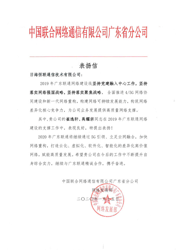 轉發(fā)“中國聯合網絡通信有限公司廣東省分公司網絡發(fā)展部”對我公司員工的一封表揚信